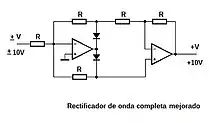 El uso de op-amps y realimentaciones elimina las caídas de tensión de los diodos en la rectificación de onda completa.[1]