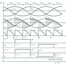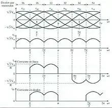 - Tiene un total de 12 transiciones para cada periodo del generador de alterna, dado que se produce una transición entre los tiristores en conducción cada 30°.