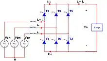 Cuando wt=(π/6+α), el tiristor T6 ya está conduciendo, y el tiristor TI se activa. Durante el intervalo (π/6+α) ≤ wt ≤ (π/2+α), los tiristores TI y T6 conducen y aparece la tensión de línea a línea Vab = Van - Vbn a través de la carga. Cuando wt =(π/2+α), se dispara el tiristor T2 y de inmediato el tiristor T6 se polariza en sentido inverso. T6 se desactiva por conmutación natural. Durante el intervalo (π/2+α)≤ wt ≤(5π/6+α) conducen los tiristores TI y T2 Y aparece la tensión de línea a línea Vac a través de la carga. Si se numeran los tiristores como se indica en la figura del circuito rectificador trifásico controlado, la secuencia de disparo es 1-2,2-3,3-4,4-5,5-6 y 6-1.