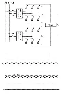 Un puente trifásico produce una tensión de salida de seis pulsos. Para aplicaciones con grandes potencias, como por ejemplo transmisión de CC de alta tensión (HVDC), y para impulsores de CC para motores, se requiere en general una salida de doce pulsos para reducir los rizos en la salida, y para aumentar las frecuencias de los mismos. Se pueden combinar dos puentes de seis pulsos, sea en serie o en paralelo, para producir una salida con 12 pulsos efectivos. Para el circuito del convertidor se puede obtener un desplazamiento de fase de 30° entre los devanados secundarios, conectando un secundario en estrella (Y) y el otro en delta (Δ). Con este rectificador se puede llevar a cabo una reducción mayor de armónicos de salida, que en un rectificador de 6 pulsos. Mediante una conexión en serie la tensión total de salida es la suma de las salidas de los dos puentes de seis pulsos. Los ángulos de disparo de los puentes suelen ser iguales.