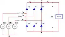 Un rectificador trifásico o convertidor trifásico es un dispositivo electrónico capaz de convertir una corriente alterna de entrada en una corriente continua de salida, mediante dispositivos semiconductores capaces de manejar grandes potencias como diodos, tiristores, válvulas de mercurio (usados hace más de 100 años), entre otros. El rectificador trifásico cumple con la misma función que un rectificador monofásico, con la diferencia que estos rectificadores son alimentados por fuentes trifásicas, por lo que son más eficientes y pueden manejar grandes potencias, ya que en su salida presentan menor rizado de la señal. Son utilizados principalmente en la industria para producir voltajes y corrientes continuas que generalmente impulsan cargas de gran potencia, como motores DC. A pesar de que estos rectificadores presentan menos rizo que un rectificador convencional, en muchas aplicaciones el factor de potencia y la distorsión armónica total de la línea se ven afectados, es por ello que se requiere el uso de filtros de armónicos. Una de las aplicaciones en donde se presenta este fenómeno, es en los enlaces de transmisión de alto voltaje (HVDC), en donde las estaciones de conversión cuentan con filtros de armónicos que reducen la distorsión en la señal que producen los convertidores, para que sea transmitida con calidad y no se introduzcan perturbaciones a la red eléctrica.