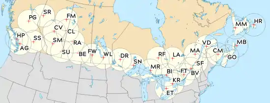 | Marion Bridge | Sudeste del isla del Cabo Bretón | Nueva Escocia | 45.94972, -60.20521 | CASMB | S | METEOR 1700S | Marion Bridge | Radar puesto en servicio en octubre de 2019, en sustitución del anterior radar de banda C CXMB. |