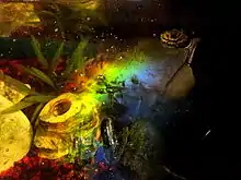 Un disco de vinilo estándar prensado, cuando se ve desde un ángulo bajo perpendicular a las ranuras, muestra un efecto similar pero menos definido al de un CD o DVD. Esto se debe al ángulo de visión (menor que el ángulo crítico de reflexión del vinilo negro) y la trayectoria de la luz que se refleja debido a que esta es modificada por los surcos, dejando un patrón de arco iris por detrás.