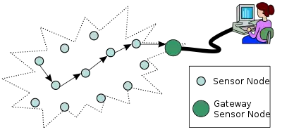 - No se utiliza infraestructura de red: Una red sensora no tiene necesidad alguna de infraestructura para poder operar, ya que sus nodos pueden actuar de emisores, receptores o enrutadores de la información. Sin embargo, hay que destacar en el concepto de red sensora la figura del nodo recolector (también denominados sink node), que es el nodo que recolecta la información y por el cual se recoge la información generada normalmente en tiempo discreto. Esta información generalmente es adquirida por un ordenador conectado a este nodo y es sobre el ordenador que recae la posibilidad de transmitir los datos por tecnologías inalámbricas o cableadas según sea el caso.