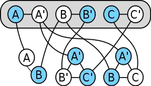 Ejemplo de reducción de un problema de satisfacibilidad booleana a un problema de cobertura de vértices. Los vértices azules forman una cobertura que se corresponde con los valores verdaderos.