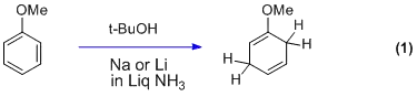 La reducción del anisol es uno de los ejemplos más simples y se muestra en la ecuación 1. Otro ejemplo es el del ácido benzoico que se ilustra en la ecuación 2.