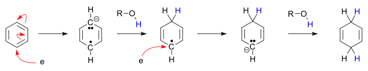 Una solución de sodio en amoníaco líquido consiste en la sal de electruro [Na(NH3)x]+ e, asociado con el color azul intenso de estas soluciones. Los electrones solvatados se adicionan al anillo aromático para formar un radical aniónico. El alcohol proporciona un protón al carbanión. Posteriormente se vuelve a adicionar otro electrón solvatado, se produce otro carbanión que reacciona con otro protón del alcohol. Para la mayoría de los sustratos, el amoníaco no es suficientemente ácido.[14]