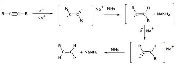 La reacción de Birch puede ser utilizada también en la hidrogenación de alquinos para dar alquenos trans: