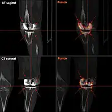 - Cyteval C (2016). «Imaging of knee implants and related complications». Diagnostic and Interventional Imaging 97 (7-8): 809-21. PMID 27423710. doi:10.1016/j.diii.2016.02.015.