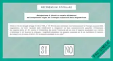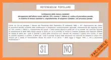 - la abolición de la ley Severino: la pregunta propone la abolición del decreto legislativo Severino sobre la confiabilidad, inelegibilidad y caducidad automática de parlamentarios, representantes gubernamentales, consejeros regionales, alcaldes y administradores locales en caso de condena.