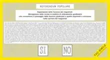 ¿Quiere que sea derogada la Ley del 24 de marzo de 1958, n. 195 (Reglas sobre la constitución y funcionamiento del Consejo Superior de la Magistratura), en el texto resultante de las modificaciones y adiciones que posteriormente se le hicieron, limitándose a la parte siguiente: el artículo 25, inciso 3, limitándose a las palabras “junto con una lista de magistrados presentadores no menos de veinticinco y no más de cincuenta. Los magistrados ponentes no podrán presentar más de una candidatura en cada uno de los colegios a que se refiere el apartado 2 del artículo 23, ni podrán postularse”?[9]