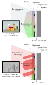 Gracias a su longitud de onda más elevada que la luz visible, la luz infrarroja es absorbida por los pigmentos y substratos distintos de los del espectro visible. Así, traspasa varias capas de pinturas que son opacas para la luz visible, pero queda absorbida por ciertos componentes especialmente las capas bajas a base de carbono y por las acumulaciones de pintura. Por fin, las capas de preparaciones del fondo de la tela reflejan esta luz.[3]