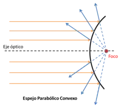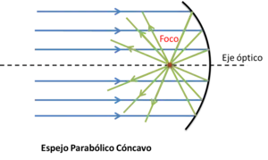 En un espejo parabólico cóncavo o convexo, el eje de revolución es el eje óptico. Tiene la propiedad de que todos los rayos paralelos a este eje que llegan al espejo se reflejan pasando por el foco. Por la propiedad de la inversión del camino óptico ocurre el fenómeno inverso y si en el foco está situada la fuente de luz, los rayos que emerjan del foco se reflejarán en el espejo tomando una trayectoria paralela al eje óptico.