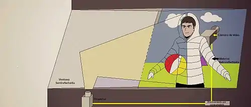 • La pantalla semitransparente a la que llega la proyección tiene una película semirreflectora donde se refleja la imagen hacia la persona que lleva la capa. A la vez, permite al observador ver toda la escena que está detrás de la pantalla.