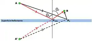 Si un rayo emitido por A se refleja en un punto P y llega a B. La longitud de la trayectoria A-P1-B seguida por este rayo es igual a la de la trayectoria A'-P1-B, siendo A’ la fuente puntual A reflejada en la superficie.