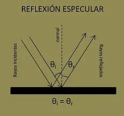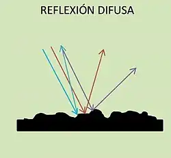 La reflexión que tiene lugar en una superficie lisa y pulida se denomina reflexión especular, de la palabra de origen latino «espejo». Por otro lado, a la reflexión en una superficie rugosa se le llama reflexión difusa. En este último caso, los rayos procedentes de un punto se reflejan en direcciones aleatorias y no convergen en ningún punto, por lo que no se genera ninguna imagen especular. El sistema óptico del ojo humano se encarga de recoger los rayos difundidos por el objeto que le llega directamente y forma con ellos la imagen de dicho objeto.[9]
