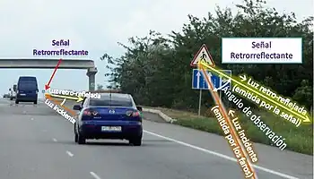 Una aplicación de la retrorreflexión se utiliza en las señales de tráfico, para que la luz que emiten los faros se refleje en la dirección de la que originalmente procede. De esta forma, la imagen de la señal que le llega al conductor aparece reforzada para avisarle de un peligro.