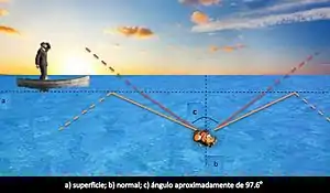 Ejemplo de reflexión total: si el pez mira cualquier punto dentro de las líneas rojas podrá ver fuera de la superficie, más allá de esos límites solo puede ver el fondo del escenario reflejado en la superficie (reflexión especular). Si mira directamente hacia el pescador (línea amarilla) no lo podrá ver, pero si mira a partir de las líneas rojas que definen el ángulo límite (agua-aire), y en el interior del tubo cónico de ángulo c = 97° que forman, podrá verlo.