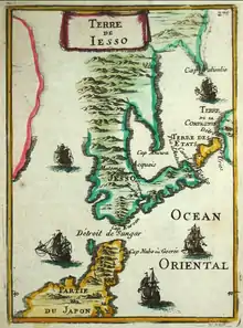 La primera descripción publicada en el oeste acerca de Ezo fue traída a Europa por Isaac Titsingh en 1796. Su pequeña biblioteca de libros japoneses incluía el Sangoku Tsūran Zusetsu (三国通覧図説 An Illustrated Description of Three Countries) escrito por Hayashi Shihei.[6] Este libro publicado en 1785, describía la región de Ezo y su gente.[7]