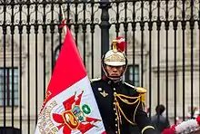 Pelotón de Dragones de la Guardia del Regimiento de Caballería "Mariscal Domingo Nieto" durante una Parada Militar por Fiestas Patrias. Su uniforme consta de lo siguiente: Casco plateado de Dragón Francés Modelo 1872, guerrera de Dragón Francés Modelo 1879 y breeches y botas de tubo de Dragón Francés Modelos 1914.