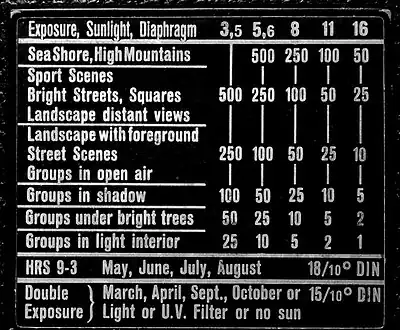 Una forma elaborada de la regla 16/f es ajustar la velocidad de obturación a la velocidad más cercana al recíproco del valor ISO de sensibilidad de la película y su número focal f, según la tabla siguiente:[5][6]