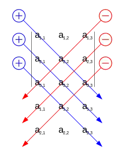 En primer lugar, repetir las dos primeras filas de la matriz debajo de la misma de manera que queden cinco filas. Después sumar los productos de las diagonales descendentes (en línea continua) y sustraer los productos de las diagonales ascendentes (en trazos). Esto resulta en:
