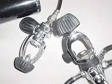 - Primera etapa: Es la pieza que se conecta directamente a la botella. Realiza una primera reducción de la presión, de alta presión a presión intermedia y distribuye el aire (u otro gas) a los latiguillos.