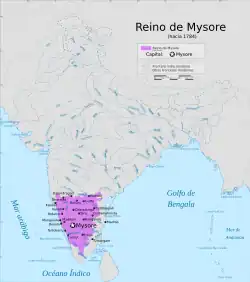 ![]() El Reino de Mysore, en el año 1784 (máxima extensión). | |||||||||||||||||||||||||||||||