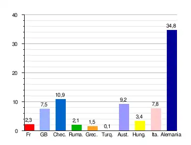 El comercio exterior no favorecía la política de alianzas yugoslava, siendo mucho mayor con sus teóricos enemigos que con sus aliados.[76][59] Las principales exportaciones del país, que decayeron enormemente durante la Gran Depresión (de ocho millardos de dinares a tres entre 1928 y 1933),[12] consistían principalmente en madera, productos agrícolas y ganaderos[77] y minerales. Frente a la posición sustancialmente estable del resto de productos en proporción de las exportaciones yugoslavas, la venta de minerales aumentó notablemente a lo largo de la década como consecuencia de la preparación para la guerra de los importadores, principalmente Alemania. La importancia de Italia, grande al comienzo del periodo, decayó rápidamente tras la participación del país en las sanciones aprobadas por la Sociedad de Naciones por el ataque italiano a Etiopía.[76]