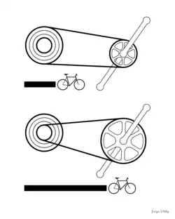 Un cambio, como una palanca, es un medio para variar el ritmo al que se realiza el trabajo. A este ritmo de variación se le denomina «razón de cambio». En una bicicleta, esta razón viene determinada por los tamaños relativos de los platos y las coronas. Como ejemplo, en el sistema de medición de «desarrollo métrico», con un plato de 52 dientes (D), una vuelta completa de las bielas hará girar cuatro veces una rueda con una corona de 13 dientes (D), (la razón es de 4:1), mientras que un plato de 28 D hará girar una vez una rueda con una corona de 28 D (la razón es de 1:1). Una combinación de 52/13 D es grande y proporciona velocidad, mientras que una combinación de 28/28 D es baja y proporcionará fuerza para subir cuestas, aunque sea lentamente.[1]