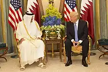 Emir Tamim bin Hamad Al Thani visitó Washington por última vez en mayo de 2017,[23] y el Presidente George W. Bush visitó Catar en 2003, donde habló a las tropas estacionadas allí.[24] Donald Rumsfeld, el 21 ° Secretario de Defensa de 2001 a 2006, también visitó Catar en 2002.[25] Secretario de Estado Hillary Clinton visitó Catar en febrero de 2010,[26] y el secretario John Kerry viajaron a Catar en marzo de 2013.[27]