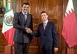 En noviembre de 2015, el Emir catarí Tamim bin Hamad Al Thani realizó una visita oficial a México.[3] Durante la visita del Emir, se firmaron varios acuerdos y memorandos, entre ellos acuerdos sobre servicios aéreos directos entre ambas naciones; acuerdos culturales y artísticos y de cooperación en el sector energético; entre otros.[4]