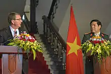 A principios de octubre de 2014, los Estados Unidos aprobaron una relajación de su antiguo embargo de armas en Vietnam.[38] En mayo de 2016, Presidente Obama anunció el levantamiento total del embargo durante su visita a Vietnam.[39]