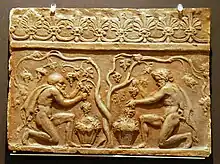 • Losas de revestimiento: En el borde superior, donde la losa forma un borde liso, había una decoración con un patrón de ova y dardos y el borde inferior está decorado con lotos, palmetas y antemas, siguiendo el contorno del patrón decorativo. Había tres o cuatro agujeros en cada relieve, a través de los cuales se sujetaban los azulejos a la pared.[17]