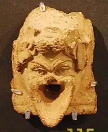 • Las antefijas se situaban en la cornisa o por encima de ella, en la hilera más baja de tejas, y cerraban el hueco frontal. Se componían de dos partes. La curva se colocaba sobre los ladrillos del alero, mientras que la parte delantera cerraba la cavidad del tejado con una losa vertical. Estos relieves pueden estar decorados y a menudo estaban pintados.[18]