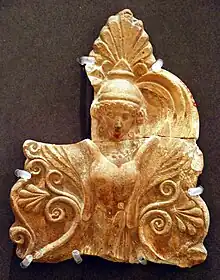 Antefija en el Museo August Kestner de Hannover: vista frontal de una Sirena con las alas extendidas.