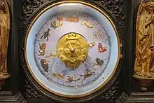- Doce diales para el calendario civil y cinco para el litúrgico dispuestos en forma de flor en la zona central, encima de la lente del péndulo. El primer grupo de diales refleja la fecha, el elemento solar que da nombre al día de la semana (p. ej. el Sol para el domingo), la estación del año, el signo del zodíaco, la duración del día y de la noche, los segundos y las horas en que amanece y atardece. Un dial aporta a su vez la fecha de Pascua, actuando como controlador de los diales que presentan las fechas de cinco días clave del calendario litúrgico católico romano. Bajo el péndulo destaca la siguiente inscripción: