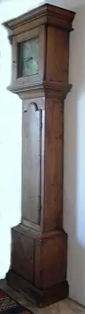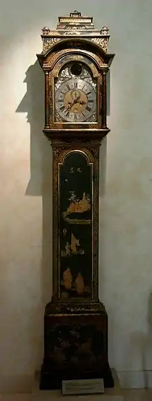 El relojero británico William Clement, quien disputó el crédito por el escape del ancla con Robert Hooke, hizo los primeros relojes de caja larga en 1680.[4] Más tarde, ese mismo año, Thomas Tompion, el relojero británico más destacado, también los estaba fabricando.[4] Los relojes de caja larga se extendieron rápidamente desde Inglaterra a otros países europeos y Asia.