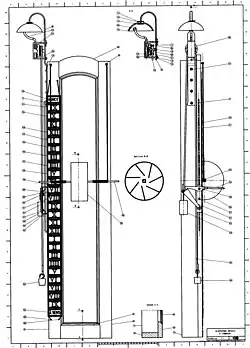 La curiosa inclinación de las mamparas permite la descarga rápida de agua en los compartimentos inferiores durante la subida manual del cilindro, dejándolo siempre aproximadamente en la misma posición de flujo.
