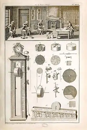 | « | Los relojes a base de agua, fabricados a Sin [por los hojalateros de estaño] eran de estaño; en París y otros lugares, se fabricaban en lata, pero tenían el inconveniente de oxidarse y eran menos precisos y mucho menos buscados que los de Sens.[2] | » |