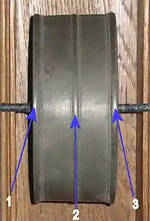 El eje que sirve de aguja o índice atraviesa el tambor (véase la figura). Se encuentra en la parte central de sección cuadrada e inclinado para un ajuste ligeramente ajustado a su carcasa. Esmaltado en una de sus bordes, deja pasar y cuña el cordón unido a dos ojos en la parte superior del marco.
