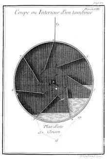 | « | Este reloj está formado por un tambor o barril de estaño bien soldado. El cañón suele tener un diámetro de 5 a 6 pulgadas [es decir, entre 135 y 162 mm; tres Hidroala de Sens tienen un tambor con un diámetro de 132 mm y un espesor de 57 mm] dividido internamente por siete tabiques del mismo metal, soldados exactamente tanto a los dos fondos como la banda circular; estas particiones no van del centro a la circunferencia, son algo transversales y tangentes a un círculo interior, cada partición se perfora con un pequeño agujero cerca de la circunferencia del tambor. El agua llega a la cantidad de 210 a 240 g de agua y debe ser destilada. | » |