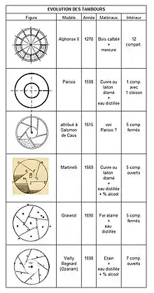 Jacques Ozanam[4] traduce el proceso utilizado hacia el 1669 en Italia ; Nicolas Bion[5] describe, en principio, para tambores de plata ; Dom Jacques Alexandre[6] lo detalla en seis páginas en su obra escrita hacia el 1705. Se resumen todos los textos : El tambor está formado por dos placas, o laterales, con un agujero cuadrado en el centro para colocar una tubería cuadrada que recibe el eje. En una de estas placas, dos agujeros : Uno para llenar el agua, el otro para tener una entrada de aire durante un posible vaciado. Las mamparas se cortan en un escudo para formar un embudo y llevar el agua al pequeño agujero central perforado con una "aguja de seda". A continuación, se sueldan las 7 particiones en una de las dos placas, así como el tubo cuadrado, y luego se suelda la segunda placa en el subconjunto anterior. Tras el equilibrio, queda rodear la totalidad de una cinta que se soldará, girando, cada tabique y lateralmente a las dos placas, para luego terminar sobre ella misma. El tambor está terminado. Es muy característico con un pequeño protuberancia central que corresponde al embudo y un pequeño cordón a cada lado de la superficie lateral, donde se realizó la soldadura. Queda poner sólo el agua destilada necesaria, aproximadamente una quinta parte del volumen, a veces con "aguardiente claro» Como anticongelante ; ambos agujeros se taparán con cera o se soldarán con habilidad para terminar. Para su identificación, por lo tanto, la caja soldada se caracterizará por sus tres protuberancias en la superficie lateral y por dos posibles agujeros a un lado[3]
