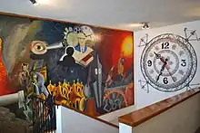 Para llegar al museo hay que ascender a través de una escalera que tiene un mural. En el mural están representados los acontecimientos relevantes en la vida de Alberto Olvera Hernández. Este aparece en el centro de un círculo formado por iconos relacionados con el tiempo, libros relacionados con su propia formación y un perfil de su esposa, Maria Charolet. A continuación se presentan doce figuras que representan a sus doce hijos, así como el violín y la mandolina que acostumbraba tocar.[8]