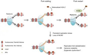 γ-H2AX no causa condensación de la cromatina por sí misma, aunque, tras pocos segundos de radiación, la proteína MDC1 ("Mediador de control de daño en el ADN 1") sí se une específicamente a γ-H2AX.[18][19] A esto se suma una acumulación lineal de la proteína RNF8 y la proteína de reparación NBS1, la cual se une a MDC1, conforme esta se une a gamma-H2AX.[20] RNF8 colabora en el desempaquetamiento de la cromatina, vía interacción con la proteína CHD4,[21] un componente del complejo desacetilasa NuRD, que también es remodelador de la cromatina. La acumulación de CHD4 en el ADN dañado es rápida, alcanzando un 50% de acumulación 40 segundos tras la radiación..[22]