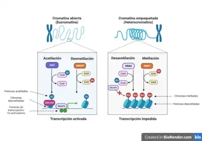 - Acetilación - por HAT (histona acetiltransferasas); desacetilación - por HDAC (histona deacetilasas)