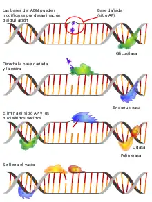 - Reparación por escisión de base (BER), que repara daños a un único nucleótido causados por oxidación, alquilación, hidrólisis o desaminación. Una glicosidasa escinde la base nitrogenada del nucleótido dañado, generando un sitio apurínico o apirimidínico. El esqueleto pentosa-fosfato residual es eliminado por una AP endonucleasa y finalmente es sustituido por el nucleótido adecuado por la actividad secuencial de ADN polimerasa y ADN ligasa.