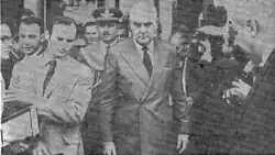 ![]() Alejandro Agustín Lanusse saliendo del domicilio de la familia del contraalmirante Francisco Agustín Alemán secuestrado por el ERP. | ||