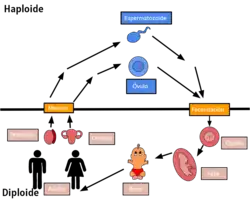 La reproducción humana es cualquier forma de reproducción sexual que tiene como consecuencia la fecundación humana. Típicamente involucra al coito vaginal entre un hombre y una mujer. Durante el coito, la interacción entre los sistemas reproductores masculino y femenino da como resultado la fecundación del óvulo de la mujer por el espermatozoide del hombre. Estas células reproductivas especializadas llamadas gametos son creadas en un proceso llamado meiosis. Mientras que las células normales contienen 46 cromosomas, 23 pares, los gametos contienen solo 23 cromosomas, y es cuando estas dos células se fusionan en un cigoto que ocurre la recombinación genética y el nuevo cigoto contiene 23 cromosomas de cada progenitor, emparejados en 23 pares.[1] Después de un periodo de gestación típico de 9 meses, ocurre el parto. La fecundación del óvulo puede lograrse mediante métodos de inseminación artificial que no involucran el coito vaginal. También existe la tecnología de reproducción asistida.