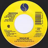 En un principio, no había planes de publicar «Rescue Me» como sencillo;[28] en este sentido, Charlie Springer, vicepresidente de ventas de Warner Bros. Records, declaró que originalmente se había pensado que fuese solo un sencillo promocional para incrementar las ventas de The Immaculate Collection.[29] No obstante, la canción recibió «tanta repercusión» en las estaciones de radio estadounidenses que Sire y Warner Bros. decidieron lanzarla oficialmente como el segundo sencillo del recopilatorio —después de «Justify My Love»—[22][30] el 23 de febrero de 1991 en los Estados Unidos.[28] La portada, tomada por el fotógrafo estadounidense Herb Ritts,[8] consistió en una «seductora» imagen proveniente del videoclip de «Justify My Love»;[22][30] el diseño de la funda del disco estuvo a cargo de Jeri Heiden.[8]